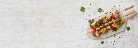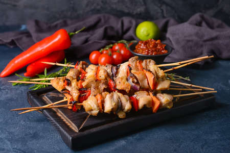 Board with grilled chicken skewers and vegetables on grunge background with space for text