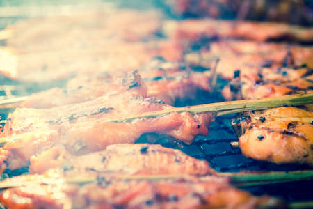 Meat on a barbecue on a street in Bangkok, Thailand. Shallow depth of field, with only a part of the barbecue in focus.