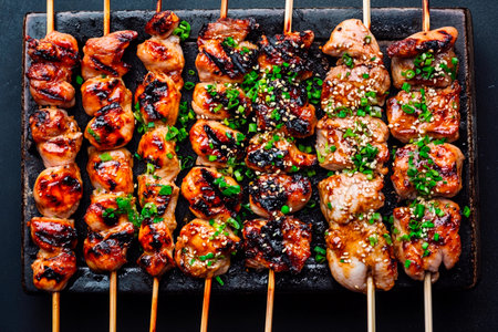 A skilled chef expertly grills yakitori skewers over a charcoal fire, creating a smoky aroma that fills the air. Perfect for food enthusiasts and culinary art lovers.
