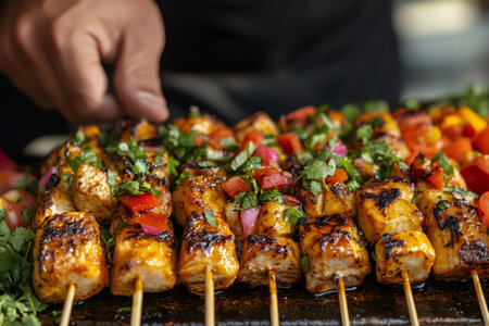 Close up of grilled chicken skewers seasoned with fresh herbs and vegetables, being prepared by a chef