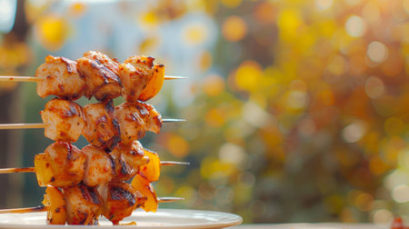 Grilled chicken kebabs on skewers in a plate with blurred autumn background Concept of BBQ, outdoor cooking, fall season, food skewer. Copy space.