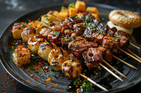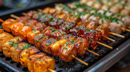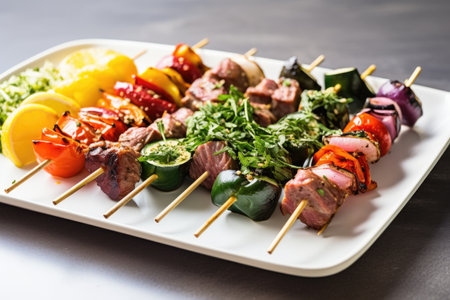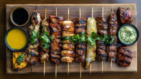 A mouthwatering display of grilled skewers featuring an array of meats and vegetables. Perfect for gatherings, this platter highlights vibrant colors, fresh herbs, and savory sauces.