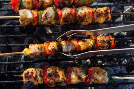 BBQ,Chicken skewers grilling on a barbecue on top of charcoal grill