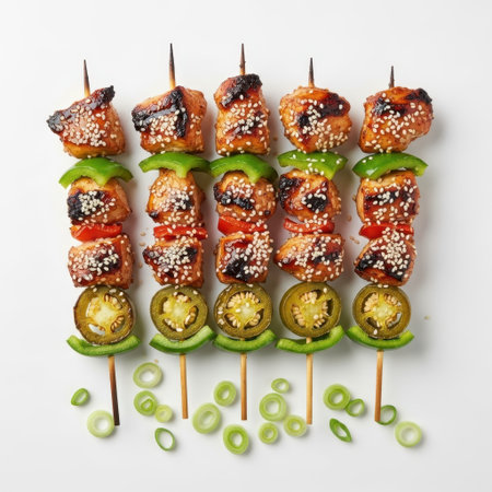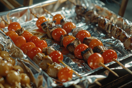 Enjoy a vibrant display of grilled skewers featuring juicy meat and fresh vegetables. Perfect for summer gatherings and outdoor cooking adventures.