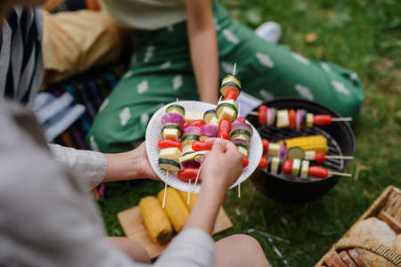 A close-up of young friends putting corn and skewers on grill and having barbecue when camping in campground.