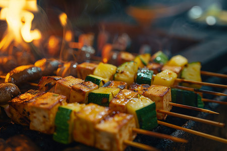 A close-up of succulent skewers of barbecued meat and colorful vegetables sizzling on a grill, with smoky flames in the background, capturing the essence of outdoor cooking.