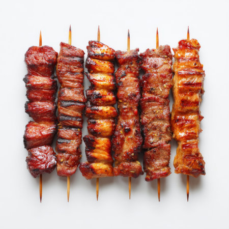 A vibrant display of assorted grilled meat skewers on a clean white background showcases a variety of flavors and textures ideal for food lovers.