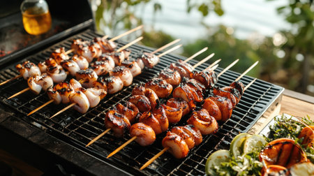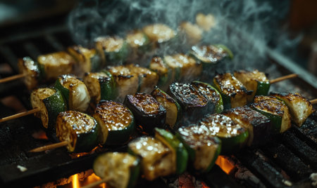Enjoy a vibrant array of grilled meat and vegetable skewers sizzling over an open flame, perfect for outdoor gatherings or summer picnics.