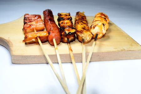 Indonesian street snacks, Various kinds of grilled consisting of sausages, meatballs, mushrooms, nuggets, etc isolated with white background