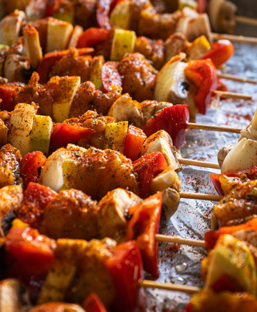 Closeup photo of fresh and delicious chicken skewers covered with spices and seasonig with mushrooms, onions, paprika, zucchini. Ideals as grill snack or party food.
