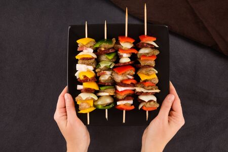 Raw kebab from meat and vegetable on black plate in woman hands. BBQ food concept.