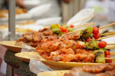 Thai cuisine barbecue chicken and pork skewers at Chatuchak weekend market in Bangkok, Thailand