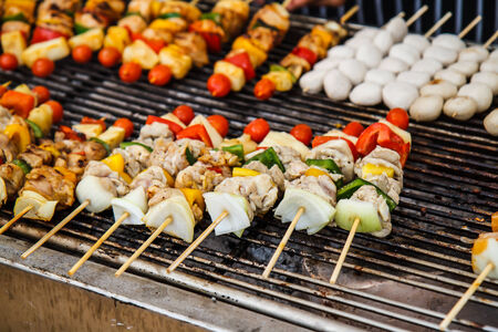 Grilling chicken bbq sauce bamboo skewers with tomatoes, pineapple and paprika peppers