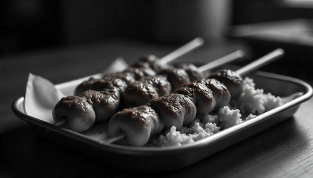 Vibrant skewers of seasoned meat on sticks, inspired by pantonepunk style, a culinary delight
