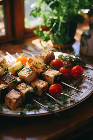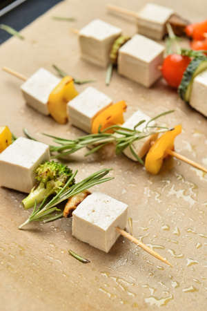 Mediterranean tofu kebobs. Vegetarian, vegan clean organic food background. Healthy Eating meal. Superfoods. Dietary. World vegan day