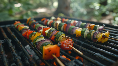 Vibrant grilled skewers featuring colorful vegetables and succulent meat over a charcoal fire, exuding delicious aromas and a summer vibe perfect for outdoor gatherings.