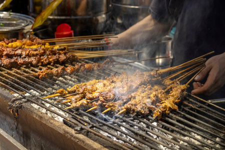 Delicious satay skewers grilling on flaming charcoal grill in street food market