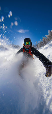 Skiing, skier, frisky - freeride, a man is stylishly skiing on a snowy slope with snow dust plume behind him