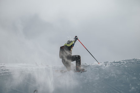 Downhill alpine skiing at high speed on powder snow