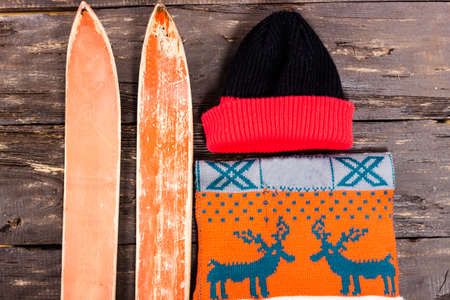 Overhead view of retro ski accessories placed on old rustic wooden table. Items included old retro wooden ski, gloves and hat. Winter sport leisure time concept.