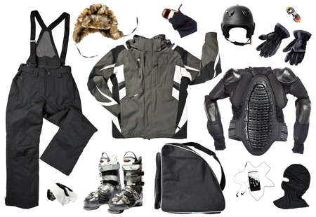 The set of all necessary men skier clothing and accessories for winter fun outdoors, isolated over white background