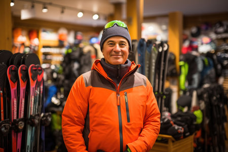 A welcoming gentleman beams with a friendly smile in a ski gear boutique, presenting the newest equipment and accessories