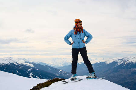 woman skier portrait with ski on the top of the mountains winter vacation