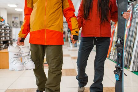 Couple with skis and boots in hands, sports shop