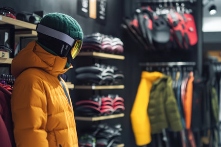 Skiing Enthusiast's Delight: In a ski gear store, a woman with a bright smile contemplates her options, her anticipation of skiing adventures evident
