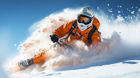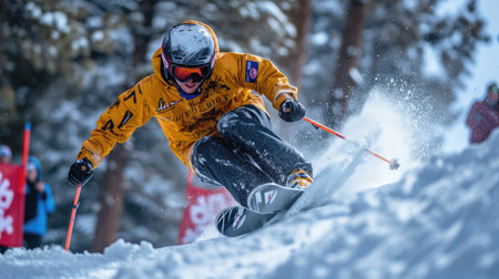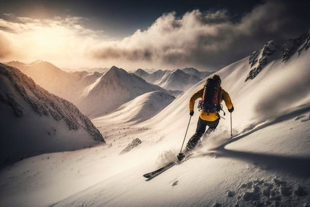Skier in yellow jacket moves at mountain slope, man skiing downhill with splash of snow in winter. Concept of sport, powder, extreme, speed, spray, paste, competition, resort. Generative AI