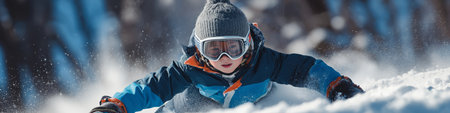 Young boy skiing down snowy slope with winter gear