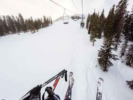 Top view of skiers legs in ski lift. Ski resort.