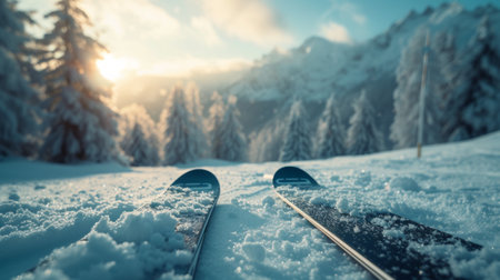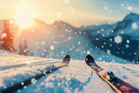 Close-up view of skis resting on fresh snow, blurred mountainous landscape in background, symbolizing winter sports adventure.