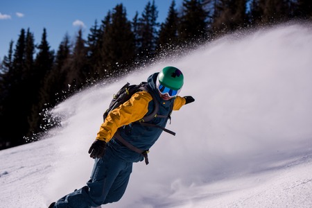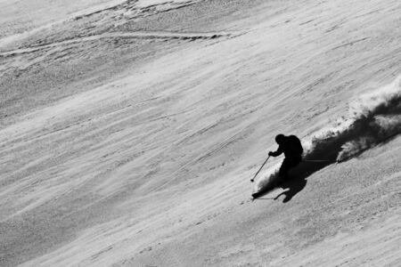 A skier at speed rides on a snowy slope freeride. The concept of winter extreme sports