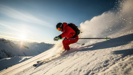 Man skiing downhill in red ski suit, snow spray, mountain sunset