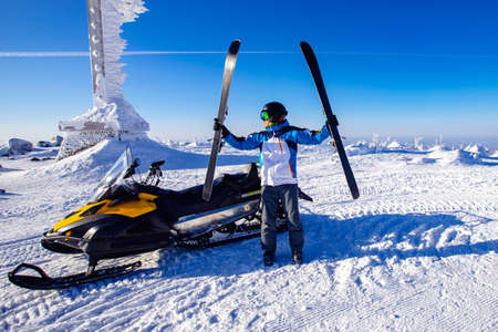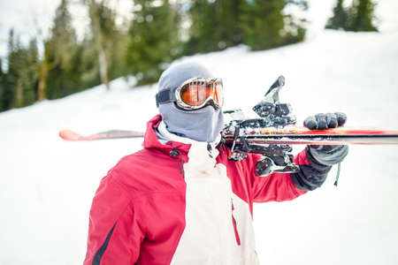 Young man holding ski at ski resort.Skier holding skis looking at the mountains.Side view of handsome skier man with mask and holding ski equipment,active winter vacation concept.