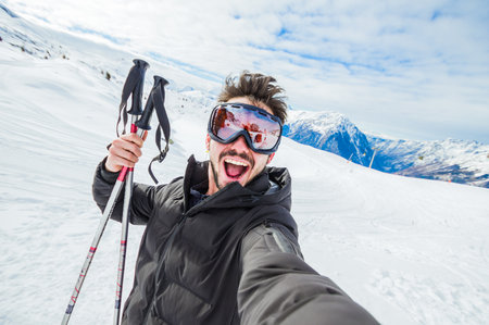 Handome skier in the snow taking a selfie on a mountain - Portrait of a funny and crazy guy at vacation in winter
