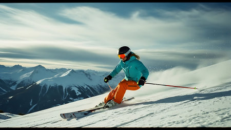 Dynamic picture of a skier on the piste in Alps. Woman skier in the soft snow. Active winter holidays, skiing downhill in sunny day.Ski rides on the track with swirls of fresh snow