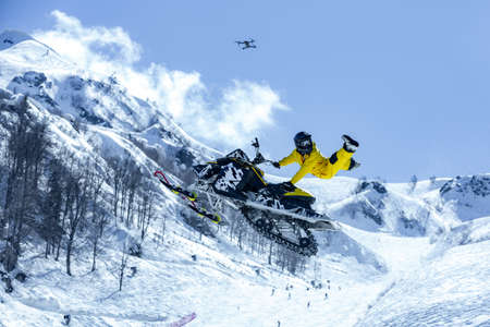 racer on a snow-cat in flight, jumps and takes off on a springboard against the snowy mountains