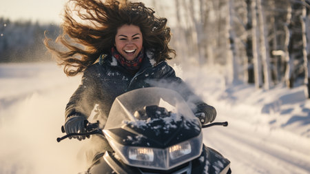 Riding on a snowmobile in Finland, female ride above the Arctic Circle. Winter sports, Healthy lifestyle