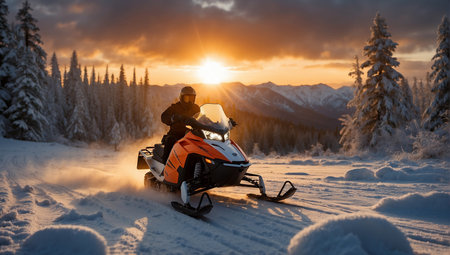 Athlete on a snowmobile in the mountains at sunset.