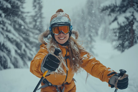 A beautiful girl with a great figure skiing joyfully in the snow while wearing a helmet