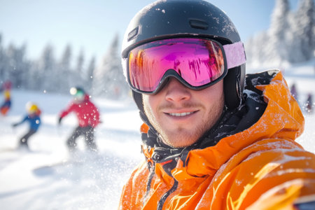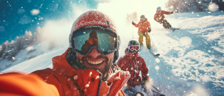 Selfie of people wearing ski equipment. Winter holiday cold adventure smart. Generate Ai