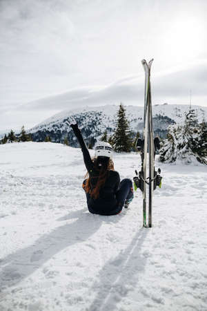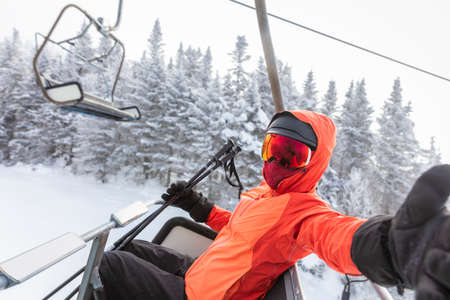 Ski vacation - skier in ski lift taking selfie photo or video using mobile phone. Ski winter vacation concept. Skiing on snow slopes in mountains, Woman having fun on snowy day. Winter sport activity