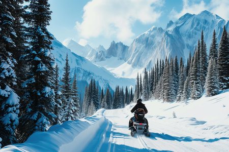 Snowmobile in the mountains at sunset. Panoramic view.