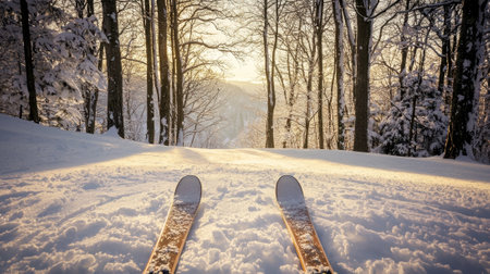 Gliding down a snowy path surrounded by tall trees as the sun sets, casting warm light on the pristine winter landscape. Perfect conditions for skiing adventures.