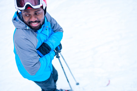 afro american man in blue jacket run ski outdoors in freeze forest