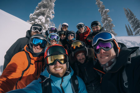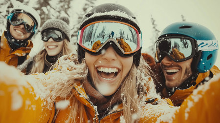 Skiers Capturing A Funfilled Moment With Friends In A Selfie. Concept Hiking Adventures, Natural Landscapes, Golden Hour Portraits, Family Gatherings, Urban Street Photography.