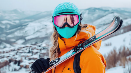 Female skier in protective mask and gear rests skis on her shoulder, posing in front of snow-covered hills and a soft winter horizon.