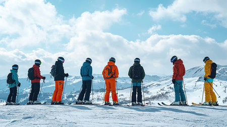 A group of skiers stands at the edge of a slope, ready to descend. They are dressed in colorful winter gear, surrounded by snowy mountains under a cloudy sky.